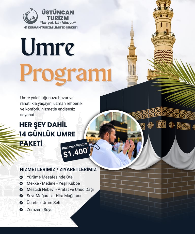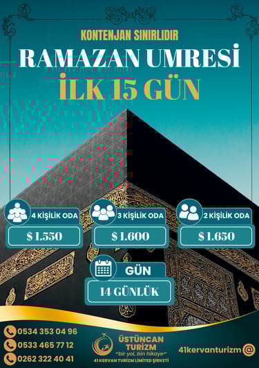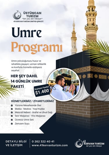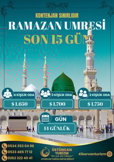 Hac, umre ve kültür turları sunuyoruz. Bu turlar, dinimiz açısından büyük öneme sahip olan kutsal mekanları ziyaret etmeyi ve kültürel zenginliklerimizi keşfetmeyi amaçlamaktadır. Katılımcılar, hem manevi hem de tarihsel bir deneyim yaşarken, rehberler eşliğinde unutulmaz anlar yaşayacaklardır.